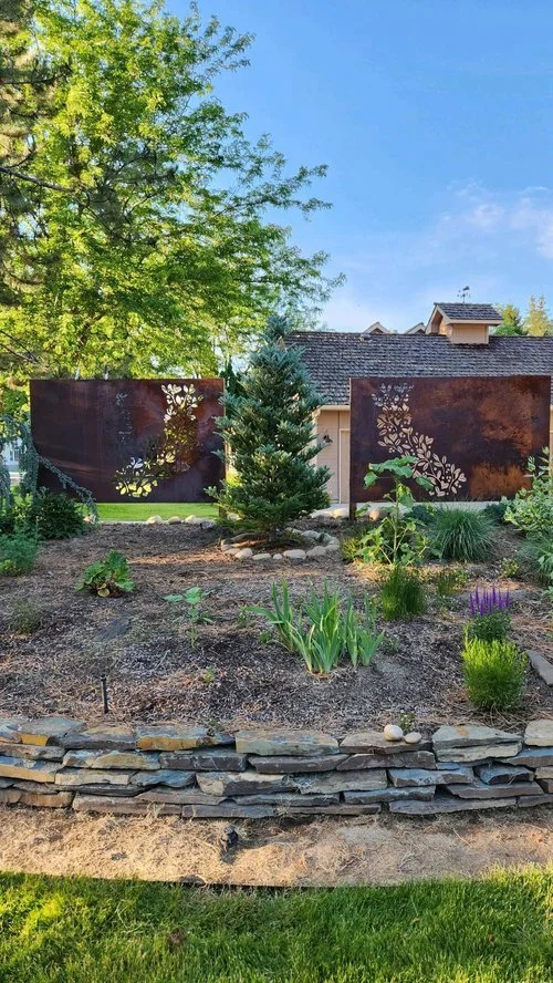The customer also wanted some privacy panels sprinkled into their landscape. These decorative privacy panels consisted of cedar posts with 4x8 sheet steel mounted between them. This sheet steel had a graphic laser cut out of it (hence the decorative panel). You will see photos below.