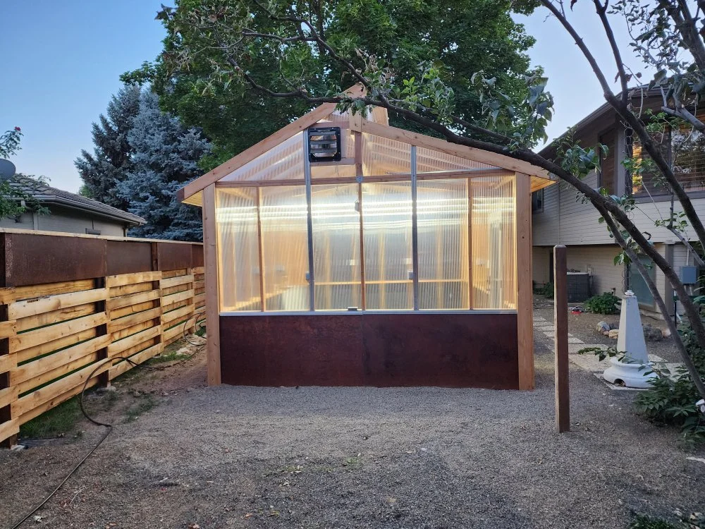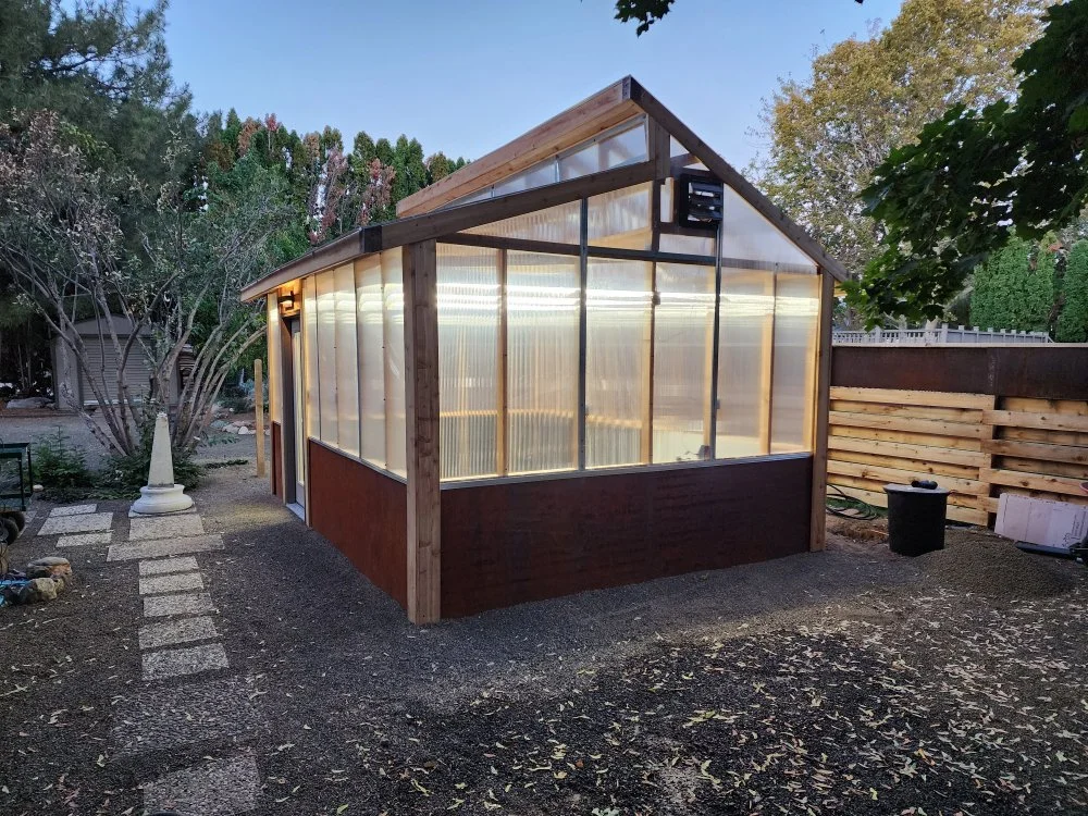 The ends of the structure on the north and south walls are flat without an overhang. This simplifies the design and also the engineering of the roof. The bottom panels are 10/20 steel that echoes the fence tops. This acts as sheeting reinforcing the structure and integrity of the bldg. For added fun the steel is a durable material (obviously) and it feels industrial, it looks great and pulls in the colors around the property well. The rust gives a feel of age or patina, this pairs well with bonsai and offers another piece of canvas to build on if the owner decided to use the structure as a backdrop for displaying trees or planting things around it.